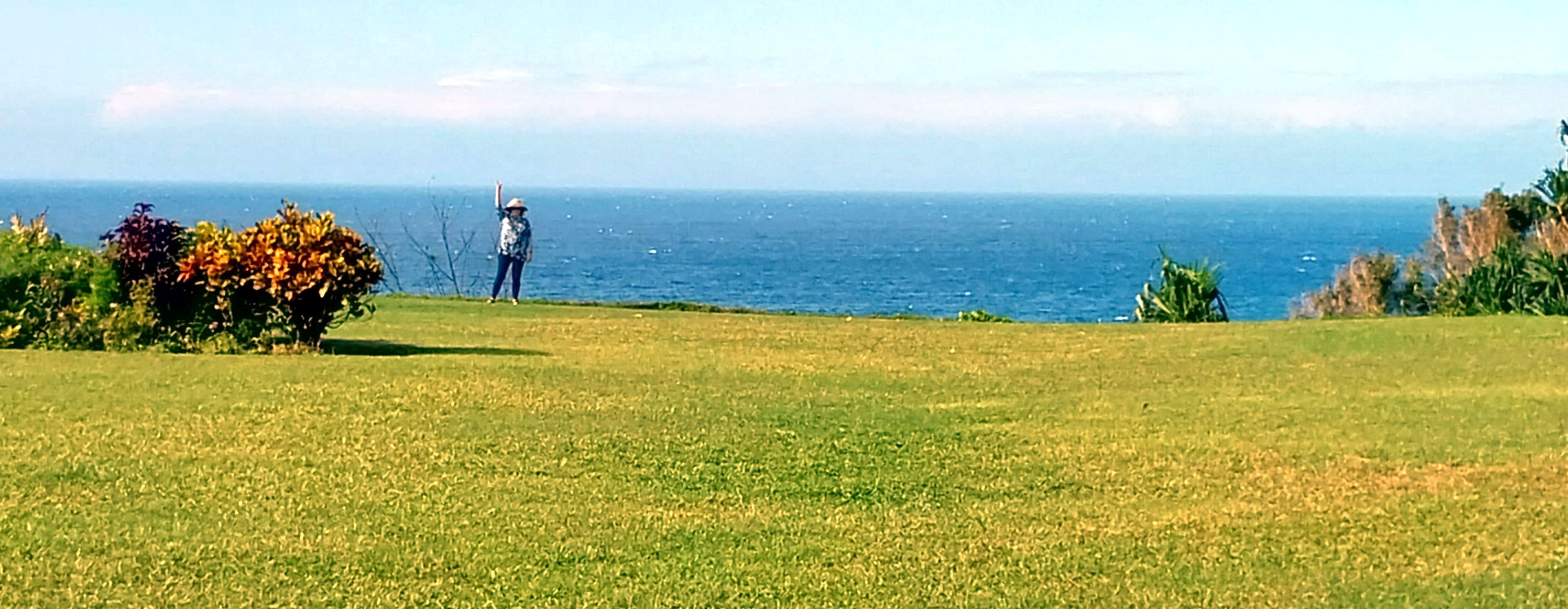 Robin waving from the top of the cliff over the shore.